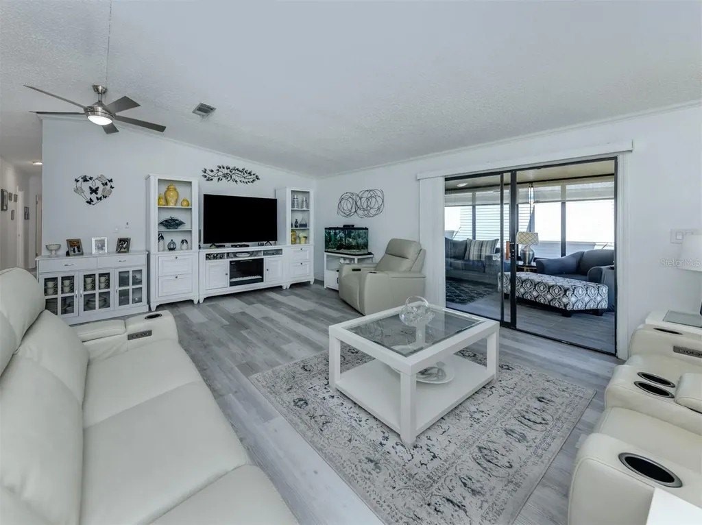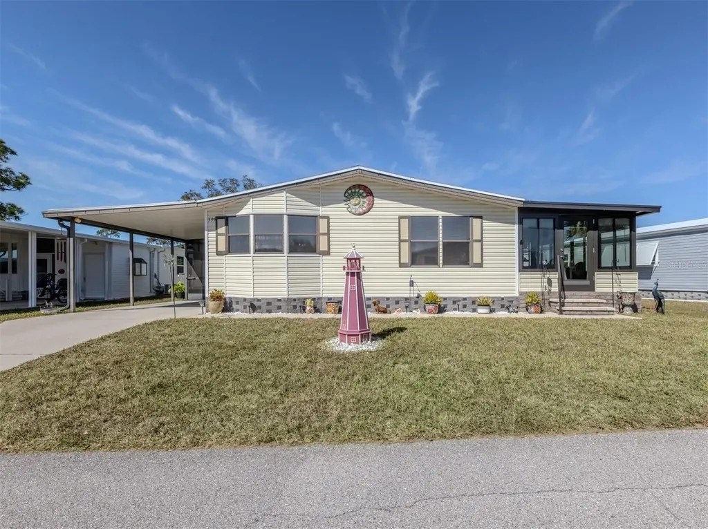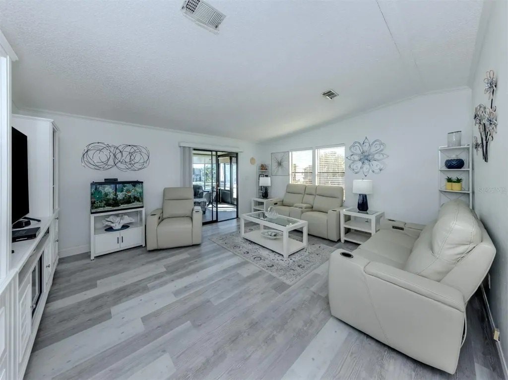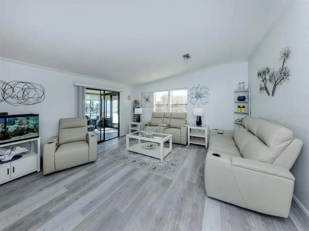 This extremely spacious and immaculate manufactured home is perfectly positioned on a peaceful preserve lot in the highly desired, pet friendly, land owned community of Harbor Isles. The show-stopping kitchen is sure to impress, featuring gorgeous epoxy countertops, stainless steel appliances, and a beautiful tile backsplash, all open to an inviting, light-filled living area. Vaulted ceilings, luxury vinyl flooring throughout, and abundant natural light create an airy, welcoming feel in every room. Just beyond the living room is a completely remodeled Florida room with sliding acrylic windows, tile floors, and a mini split AC, making it a comfortable space to enjoy year-round. Both oversized bedrooms offer generous walk-in closets, while a versatile bonus room at the entryway provides the perfect spot for a home office, hobby room, or laundry area. Outdoor living is just as appealing with a lovely screened lanai on the side of the home and an extra-large storage shed for all your needs. A shingle roof completed in 2023 adds peace of mind, making this home truly move-in ready for its next owner. Harbor Isles is a vibrant 55+ community nestled along the Myakka River, known for its resort-style amenities and active lifestyle. Residents enjoy a marina, clubhouse, pool, pickleball and tennis courts, and a full calendar of social activities, all within a beautifully maintained, land-owned setting. This is Florida living at its best, combining comfort, community, and a serene natural backdrop.