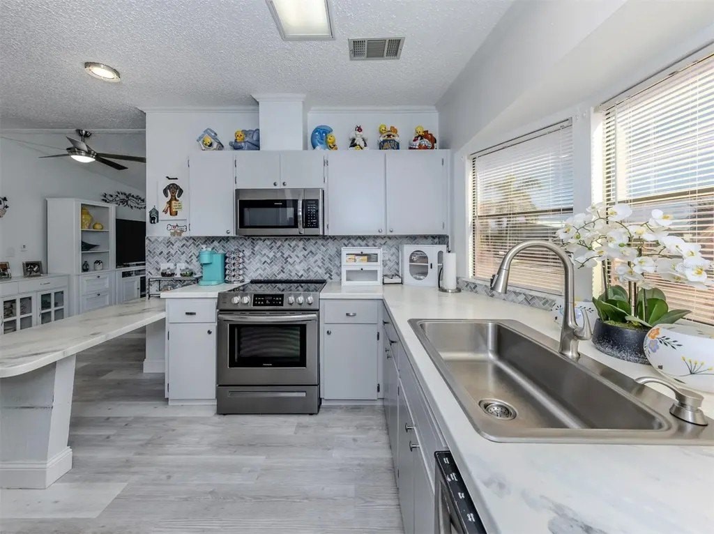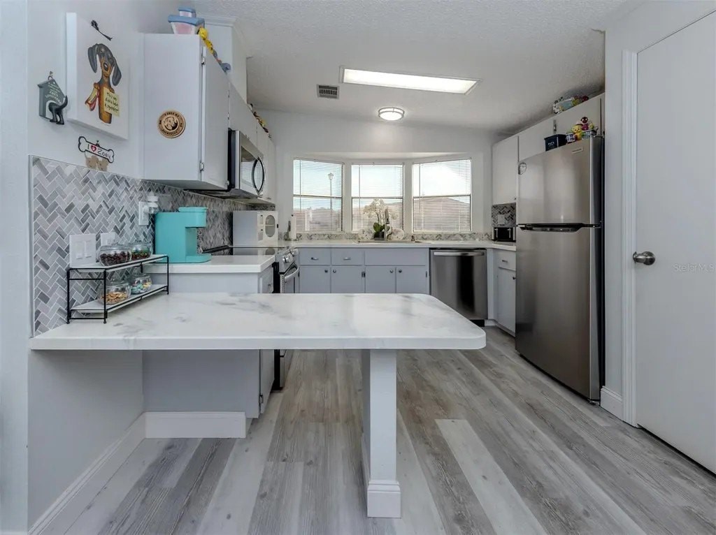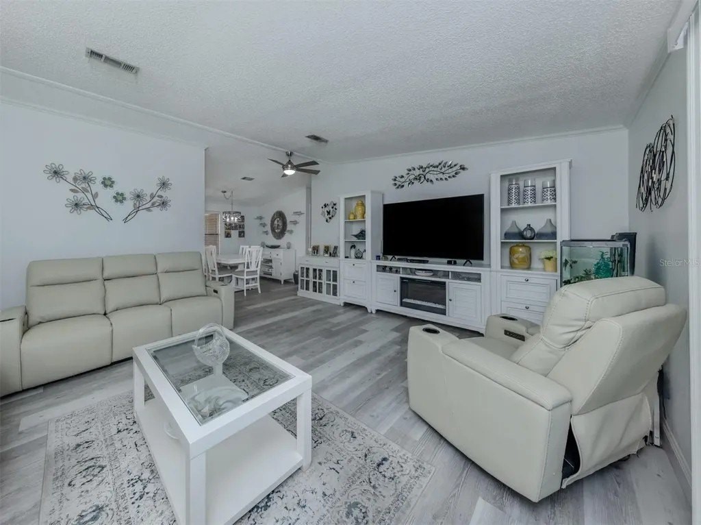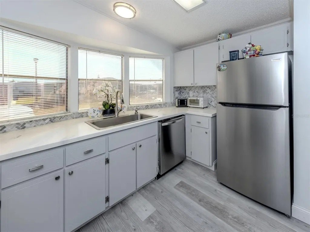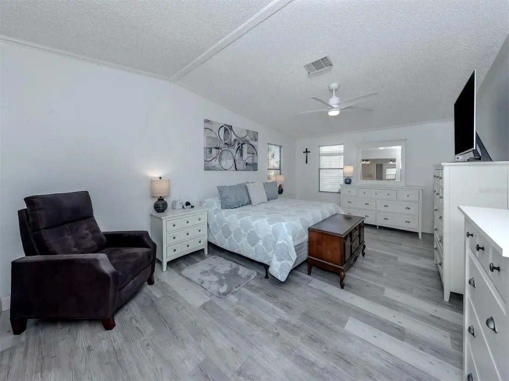 This extremely spacious and immaculate manufactured home is perfectly positioned on a peaceful preserve lot in the highly desired, pet friendly, land owned community of Harbor Isles. The show-stopping kitchen is sure to impress, featuring gorgeous epoxy countertops, stainless steel appliances, and a beautiful tile backsplash, all open to an inviting, light-filled living area. Vaulted ceilings, luxury vinyl flooring throughout, and abundant natural light create an airy, welcoming feel in every room. Just beyond the living room is a completely remodeled Florida room with sliding acrylic windows, tile floors, and a mini split AC, making it a comfortable space to enjoy year-round. Both oversized bedrooms offer generous walk-in closets, while a versatile bonus room at the entryway provides the perfect spot for a home office, hobby room, or laundry area. Outdoor living is just as appealing with a lovely screened lanai on the side of the home and an extra-large storage shed for all your needs. A shingle roof completed in 2023 adds peace of mind, making this home truly move-in ready for its next owner. Harbor Isles is a vibrant 55+ community nestled along the Myakka River, known for its resort-style amenities and active lifestyle. Residents enjoy a marina, clubhouse, pool, pickleball and tennis courts, and a full calendar of social activities, all within a beautifully maintained, land-owned setting. This is Florida living at its best, combining comfort, community, and a serene natural backdrop.